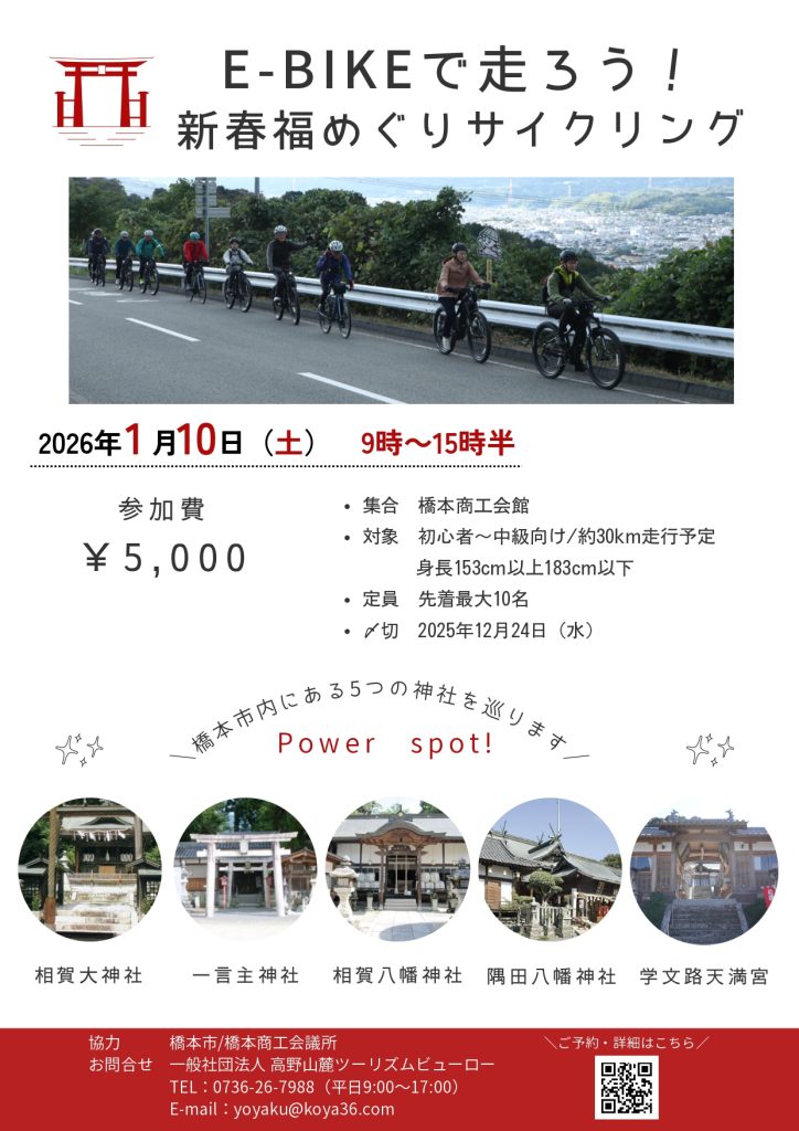 1月10日(土)には、そのうちの5社を巡る「E – B I K Eで走ろう!新春福めぐりサイクリング」も開催されます。